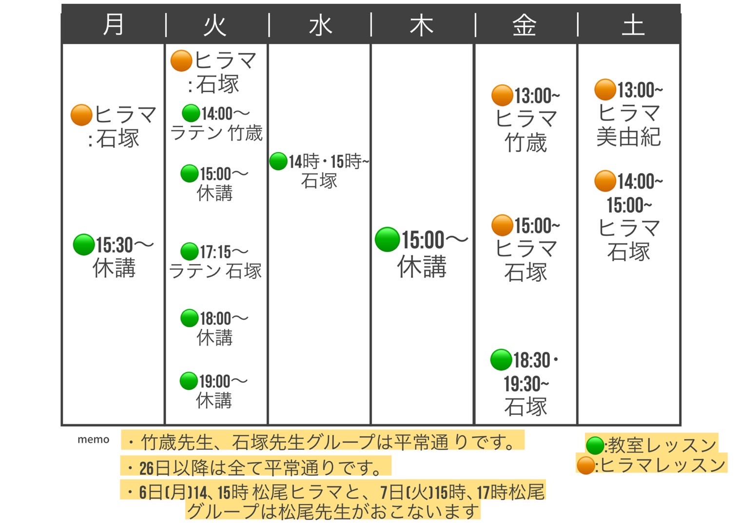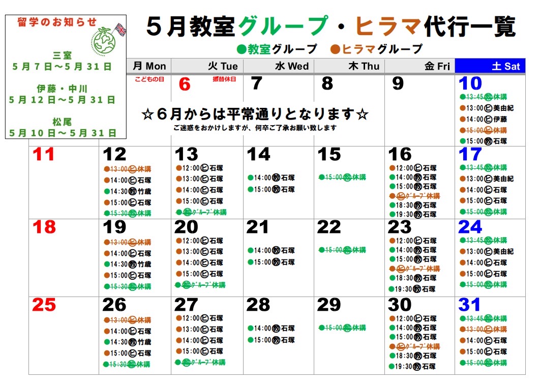スタッフの遠征・留学に伴う休講・代行を今週・来週分を以下に、再来週以降分を表にてお知らせいたします。